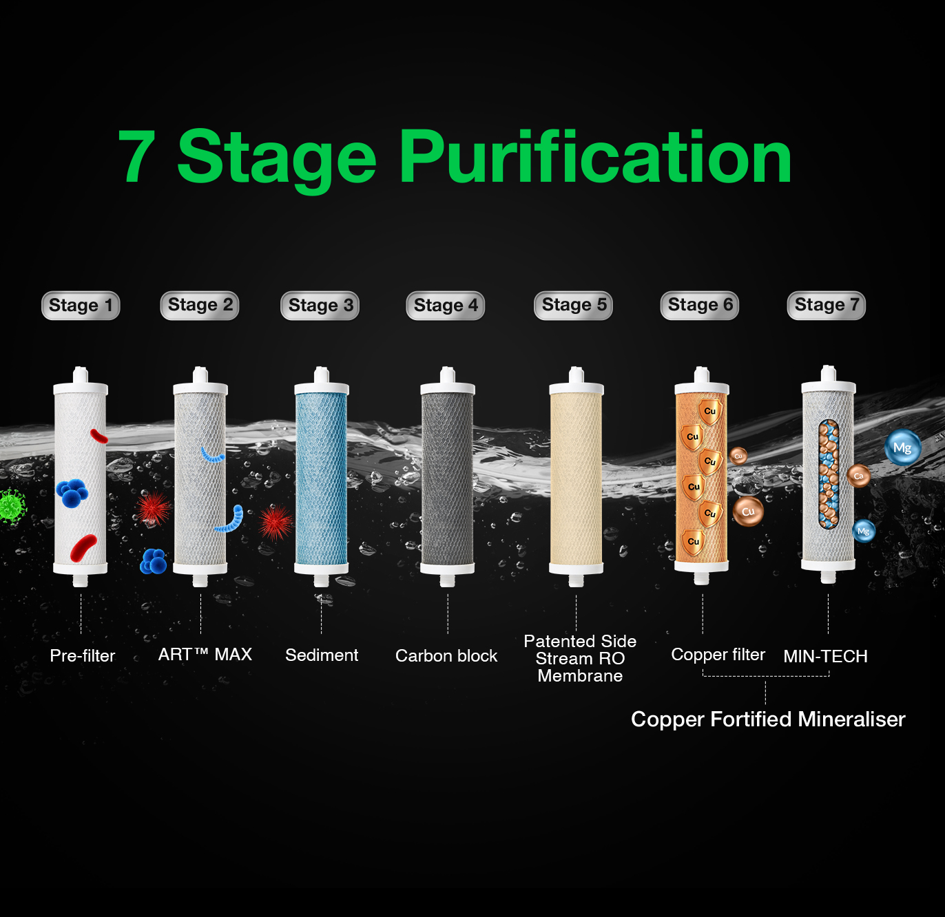 Healthy drinking water with 7-stage purification technology:Pre- filter + Art Max+ Sediment filter + Carbon filter + RO Membrane + Copper Fortified Mineralizer + Alkaline Technology